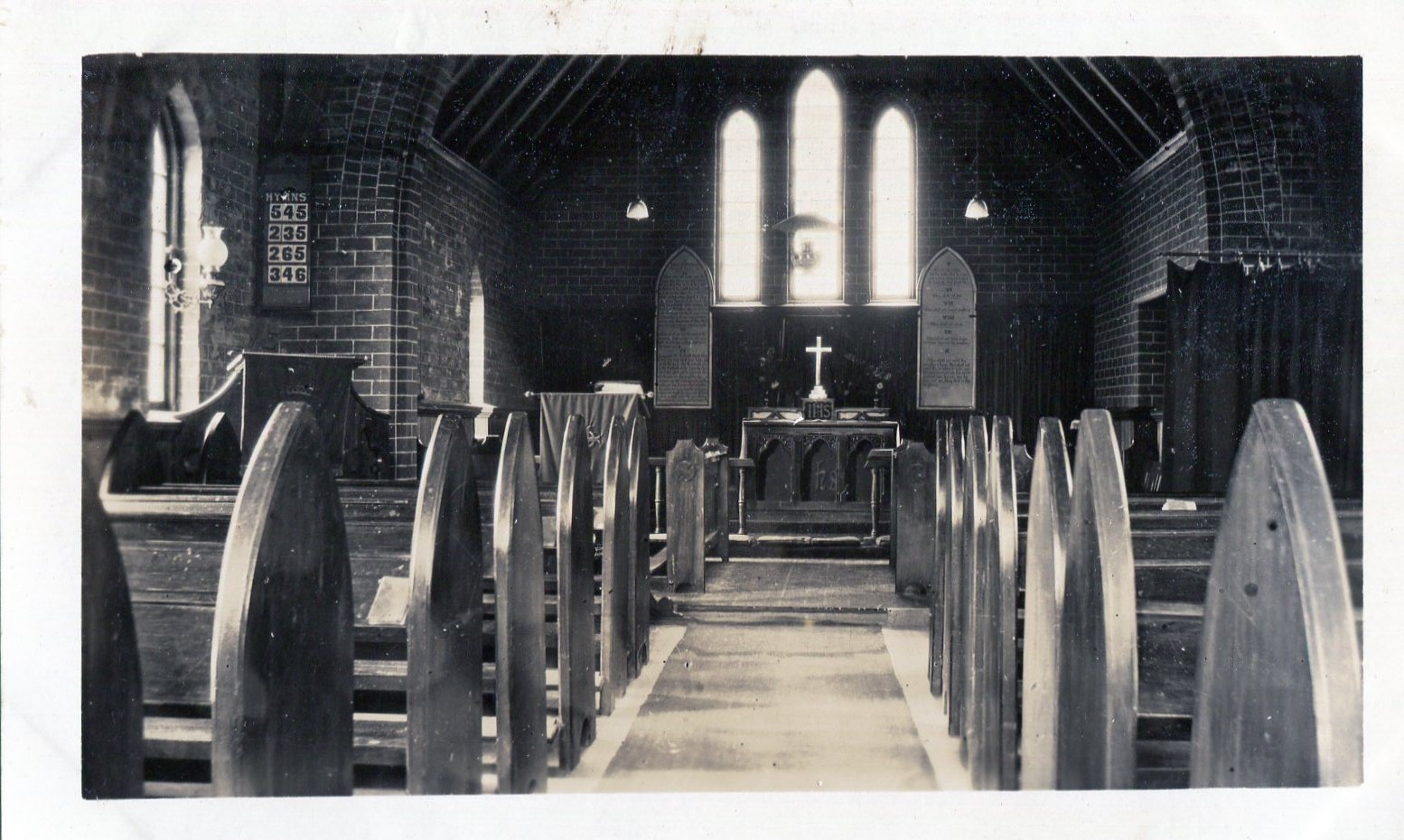 An interior view of St Peters Anglican Church located in Lawrence Street. In 1905 saw the rebuild of this new church in Gothic style which stands on a concrete foundation. This Church is built of stone procured from the neighbourhood and is brick lined. The Hymns shown on the hymn board are 545 "Saviour, Like a Shepherd" 235 "Praise Him, Praise Him", 265 "Arise, O God and Shine', 346 "Forever with the Lord."